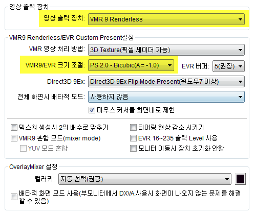 - VMR9/EVR 크기 조절: PS 2.0 - Bicubic(A=-1.0) 선택