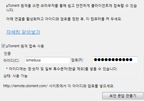 uTorrent가 이제 국내에서 많이 활성화된 것 같네요. 그만큼 저작권과 관련해서 제재가 많을 듯합니다. 이 점 유의해서 즐거운 토렌트 라이프가 되시길 바라며, 오늘은 회사나 학교, 외출 시에 스마트폰이나 외부 컴퓨터로 간단하게 원격 주소만 입력하여 자신의 컴퓨터에 있는 토렌트를 관리하고 새로운 씨앗 파일을 추가하거나 삭제할 수 있는 기능을 소개해드릴까 합니다. 복잡한 설정 없이 토렌트에서 자체적으로 제공하는 원격 설정 항목에서 아이디와 비밀번호만 입력하면 끝입니다.