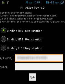 你好,我想购买你的Bluedict无广告注册版。我已经在Paypal上支付了5.99美金。你去看看查一下。我想以(IMEI 혹은 IMSI 둘 중에 한 가지 기입)的方式注册。我的号码为(IMEI나 IMSI를 선택하여 나오는 시리얼을 입력)。谢谢