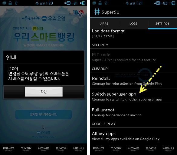 오늘은 루팅 된 스마트폰에서 우리은행, 국민은행, 농협 등 금융 어플을 실행하는 방법에 대해 알아보겠습니다. 보통 루팅과 관련해서 SuperUser 어플을 많이 사용하실 텐데요, 루팅 하면 시스템 영역에 접근할 수 있게 되어 금융 어플이 보안에 취약하다고 판단하고 이 Superuser와 Su 바이너리를 찾아내 실행을 제한합니다.
