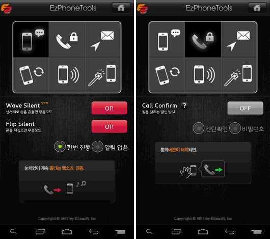 오늘 소개해드릴 안드로이드 어플은 스마트폰을 더욱더 스마트하게 만들어주는 "이지폰"입니다. 비슷한 어플로 Tasker란 다양한 기능을 갖춘 녀석이 있지만 까다로운 설정으로 초심자에게 초기 장벽이 높은 단점이 있습니다.이지폰 어플은 Tasker보다 기능이 적지만 전화 통화와 관련된 기능 중심으로 만들어진, On/Off 버튼 한 번만 눌러주면 바로 적용되는 간편함을 장점으로 내세우고 있습니다. 주요 기능으로는 흔들어 전화받기, 전화 수신 시 단말기를 뒤집어 놓으면 자동으로 무음으로 바꿔주는 기능, 전화 수신 거절 시 자동으로 SMS 보내기 등이 있습니다.