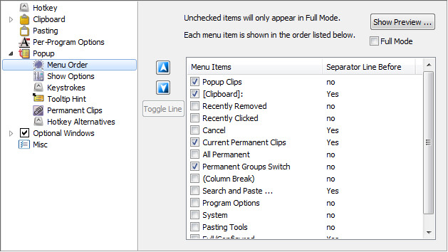 Popup > Menu Order 메뉴를 보시면 클립보드 팝업창에 표시될 리스트를 지정할 수 있습니다. 오른쪽 상단 Show Preview를 누르시면 설정한 목록의 미리 보기가 가능합니다.