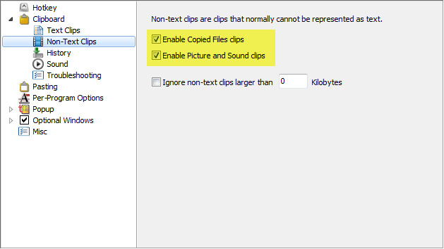 Enable Copied Files clips, Enable Picture and Sound clip 옵션에 체크하면 프로그램 클립보드에도 저장이 됩니다. 그럼 아까 지정한 클립보드 팝업 창에도 목록이 나오겠죠? ㅎㅎ