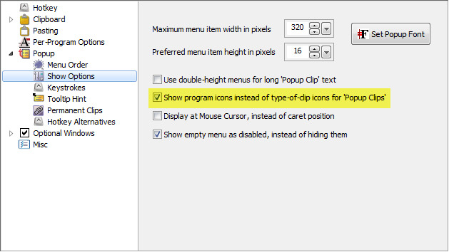 Show program icons... 항목에 체크하시면 팝업창에 저장된 클립보드 목록에서 프로그램 아이콘이 표시되어 가독성을 높여줍니다.