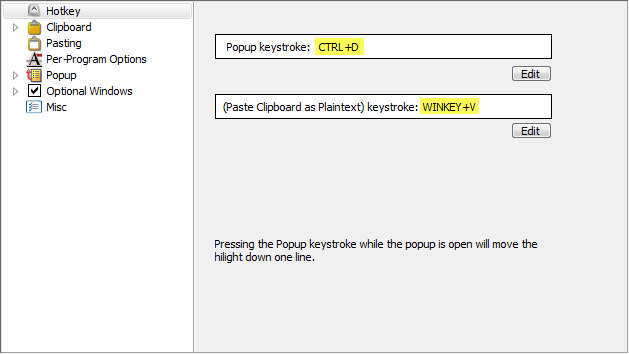 팝업 창의 단축키를 변경하려면 설정 > Hotkey > Popup keystroke 항목에서 Edit 버튼을 눌러서 변경할 수 있습니다. 그 아래는 클립보드에 복사된 내용의 서식을 제거한 텍스트로 붙여 넣기 하는 단축키입니다. 문서작성 시 유용하게 쓰일 부분이니 편하신 단축키를 지정해 놓고 사용하시면 되겠습니다.