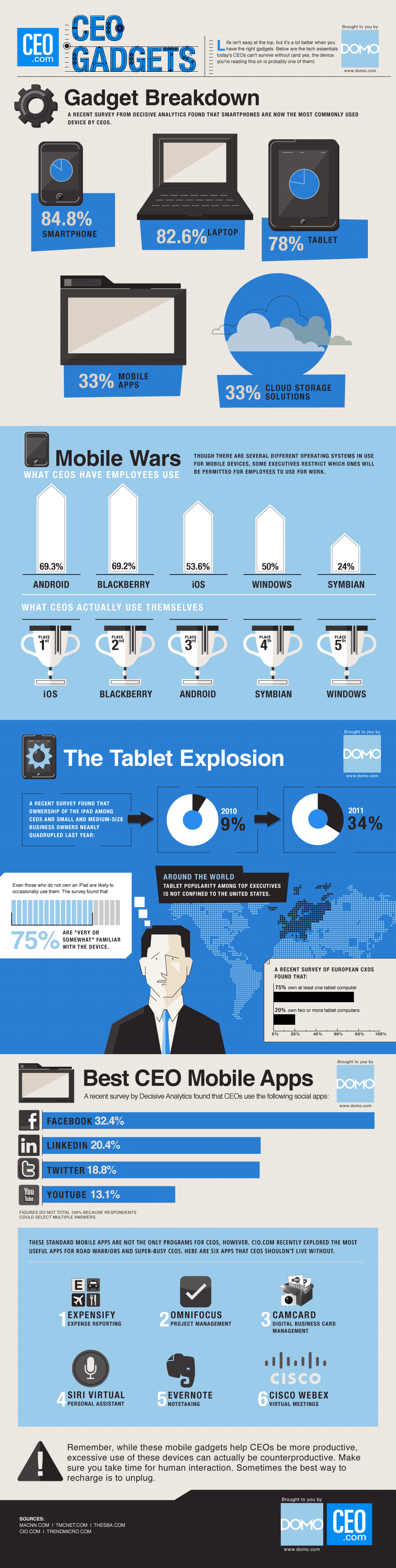 비즈니스 인사이더에 CEO들이 많이 이용하는 전자기기와 애플리케이션을 소개하는 인포그래픽이 올라왔네요. 꽤 재밌습니다. 스마트폰의 경우에 아이폰을 제일 많이 사용하고 2위가 블랙베리네요. 그리고 심비안 운영체제가 4위이고요. 저도 한때 노키아 제품을 이용했었는데 지금은 계속 추락하는 추세라서 아쉽기도 합니다만 윈도 모바일 운영체제를 탑재한 제품으로 왕좌의 자리를 다시 석권할 수 있을지 기대됩니다. 블랙베리도 국내에선 삼성과 아이폰에 밀려 크게 인기가 없었지만 해외에서 매우 잘 나갔었던 제품이죠. 70% 이상의 CEO들이 한 가지 이상의 태블릿 PC를 가지고 있고, 많이 사용하는 모바일 애플리케이션으로 페이스북과 링크드인 트위터 등이 있다고 나와있네요.
