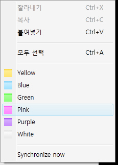 스티커의 노란색이 싫으신 분은 스티커 창 안에서 마우스 우클릭, 총 6가지 색상으로 변경할 수 있습니다. ▼