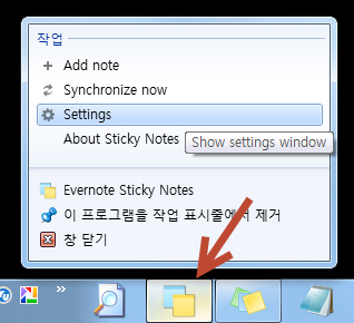 위 인증 과정을 마치면 바탕화면에 기존 윈도우 스티커 메모와 똑같은 모양에 포스트잇이 생깁니다. 자잘한 설정은 작업표시줄의 스티커 메모 아이콘을 우클릭하고 Settings를 클릭하시면 됩니다. 그 외에 노트(스티커)를 새로 추가하거나 연동하기 항목 등이 보이네요. ▼
