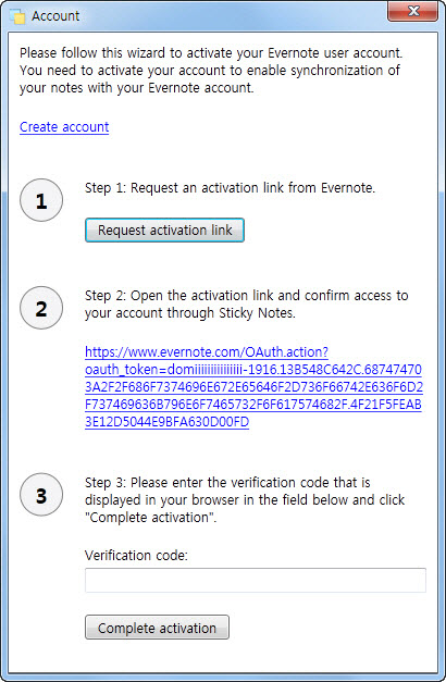 프로그램을 설치하면 위와같은 계정 연동 활성화 창이 나옵니다. 1번 항목에서 Request Activation Link 항목을 클릭하면 에버노트 사이트의 인증 화면이 뜨게 되는데 인증 버튼을 눌러줍니다. 그럼 다음 링크로 넘어가 Verification Code가 아래쪽에 생성되는데 복사한 후 위 이미지의 3번 항목에 붙여 넣기 합니다. 완료 버튼을 눌러 스티커 메모와 에버노트 연동 활성화를 마칩니다. ▼