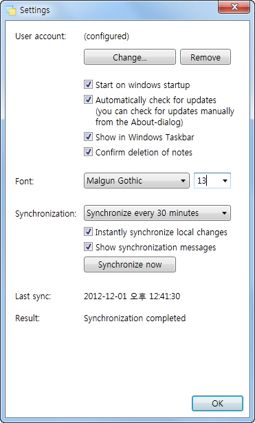 💡 설정 부분에선 윈도우 시작 시 자동실행, 업데이트 자동 확인, 작업표시줄에 표시, 삭제 시 확인 옵션을 설정할 수 있고 스티커 메모에 입력되는 글꼴을 바꿀 수 있습니다. 저는 윈도우 7 기본 글꼴인 맑은 고딕으로 했습니다. 글씨체는 13 정도가 큼지막하고 보기 좋은 듯하네요. 그 외에 싱크 간격도 설정할 수 있습니다. ▼