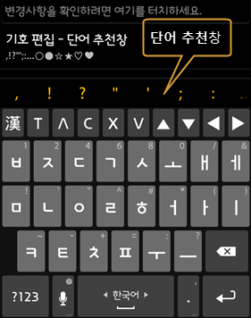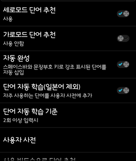 단어 추천에 체크하시면 확장 키보드 윗부분에 사용자가 키보드를 입력하는 중에 연관되는 단어를 자동으로 추천해줍니다. 또한 단어 자동 학습 기능이 있어 사용자 단어 입력 패턴/빈도수에 따라 적당한 단어를 자동으로 추천해줍니다.