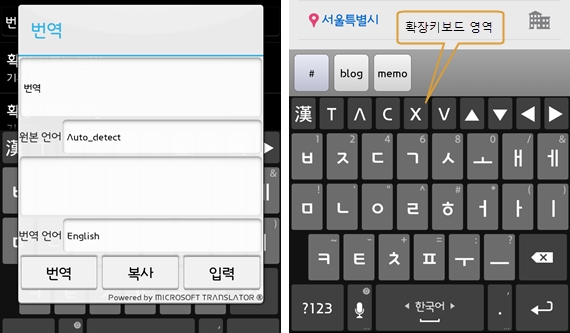 위 그림의 확장 표시된 확장 키보드 영역의 종류 및 크기 등을 설정할 수 있습니다. 확장 키보드 종류는 위 그림처럼 10x1을 사용하고 있는데 가장 깔끔하다고 생각됩니다. 확장 키보드의 높이는 60% 정도로 설정하면 보기 좋습니다. 漢버튼은 이름 그대로 한글을 한자로 변환해주고, T부분을 선택하면 입력한 텍스트를 다른 언어로 번역해주는 기능을 합니다. A는 전체 문장 선택, C는 복사, X는 잘라 넣기, V는 붙여 넣기입니다. ▲▼◀▶ 항목은 텍스트 간 눈금 이동을 가능하게 해 줍니다. 정말 유용하죠?