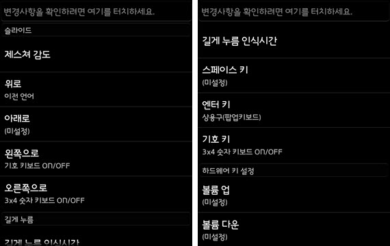 제스처와 길게누름 설정을 할 수 있는 부분입니다. 제스쳐 감도가 낮을수록 민감하게 반응합니다. 저는 8로 설정했습니다. 저 같은 경우 제스처를 위로 올릴때 이전 언어를 선택하여 한글/영어 전환이 가능하게 했습니다. (스페이스를 좌우로 밀어도 한/영 전환이 가능합니다) 왼쪽으론 기호를 오른쪽으론 숫자 키보드를 설정하여 제스쳐를 이용한 각 키보드의 접근성을 최대화했습니다. 또한 엔터 키, 기호 키 등을 길게 누를 때의 행동을 설정할 수 있습니다. 각자 사용자 입맛에 맞추어 변경해보세요.