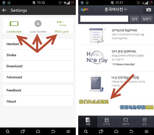 โ โ Settings ์ธ๋ถ ์ค์ ๋ฉ๋ด์ ๋๋ค. ์ ํ์ดํ์ Mini Lyric๋ฅผ ํ์ฑํํ์๋ฉด ํ์คํฌ๋ฆฐ์ด๋ , ๋ค๋ฅธ ์ด๋ค ์ดํ์ด๋ ์ฌ์๋๋ ์์ ์ ์๋ง์ด ํญ์ ํ์๋ฉ๋๋ค. (์ ๊ทธ๋ฆผ ์ค๋ฅธ์ชฝ) ์๋ง์ ์์น๋ ์ํ๋ก ์กฐ์ ๊ฐ๋ฅํฉ๋๋ค. ๋ ธ๋๋ฅผ ๋ค์ผ๋ฉฐ ์ค๊ตญ์ด๋ฅผ ๊ณต๋ถํ์๊ณ ์ถ์ ๋ถ์ ์ฌ์ ์ดํ์ ๋ฐ์ด๋๊ณ ์๋ง์ ๋ชจ๋ฅด๋ ๋จ์ด๊ฐ ์์ผ๋ฉด ๋ฐ๋ก ์ฐพ์๋ณผ ์ ์๋ ํ์ต๊ธฐํ๋ฅผ ์ ๊ณตํฉ๋๋ค.