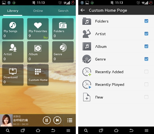 ๋ฉ์ธ ํ๋ฉด์ ๋๋ค. ์ฆ๊ฒจ ๋ฃ๋ ์์ , ๋ค์ด๋ก๋ํ ์์ ๋ฑ์ ํญ๋ชฉ๋ค์ ๋ณผ ์ ์์ผ๋ฉฐ, Custom Home ๋ฉ๋ด๋ฅผ ์ด์ฉํด ์ํ๋ ๋ฉ๋ด๋ฅผ ์ถ๊ฐ/์ญ์ ํ ์ ์์ต๋๋ค.