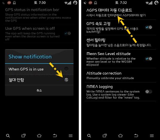 - GPS Status 어플을 실행한 뒤 설정 > 센서 > AGPS 데이터 자동 다운로드에서 1일 이하로 설정해 줍니다. 이제 향상된(?) GPS 성능을 테스트해 보세요.
