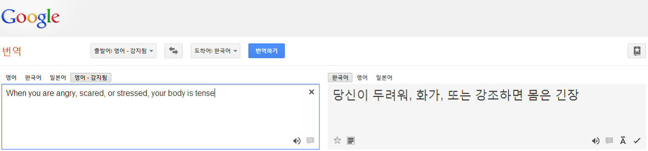 ▲ When you are angry, scared, or stressed, your body is tense 이 영어 문장을 한국어로 번역하면 위처럼 문장으로 보기 힘들 정도의 번역 결과물이 나옵니다.