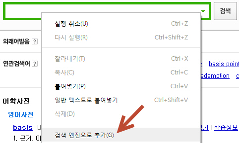 ▽ 검색 플러그인/공급자에 관한 추가 팁. 네이버나 다음, 구글 등의 사이트에서 검색 박스창에 마우스를 대고 우클릭 > 검색 엔진으로 추가(G) 항목을 선택하시면 URL 부분에 해당 사이트의 검색 공급자 주소가 표시됩니다. 이 부분을 복사하여 mkmenu 검색 옵션에 사이트 이름을 지정하시고 붙여넣기 하시면 되겠습니다.