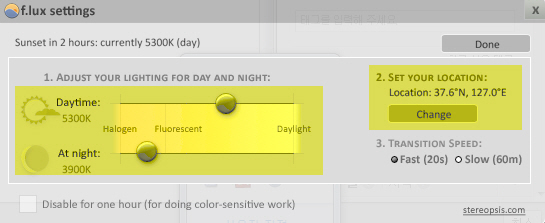 Disable for one hour 버튼을 누르면 한 시간 동안 flux가 중지되는데 사진, 그래픽, 동영상 작업 등 색상에 민감한 작업을 하실 때 체크하시면 되겠네요 :)