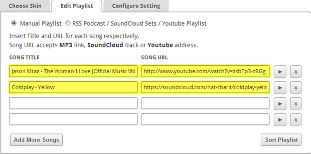 음악을 추가하는 두 번째 단계입니다. 추가하고 싶은 곡을 SoundCloud나 Youtube를 통해 URL을(주소창에서 복사) 가져와 복사하시면 됩니다. 곡 이름은 임의로 지정 가능합니다.