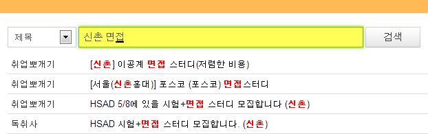 검색은 주로 '지역', '스터디 종류' 키워드를 입력하시면 원하는 스터디를 찾을 수 있습니다. 결과는 취업뽀개기, 독취사, 닥취 등 유명 카페에 올라온 스터디 모집 글들을 긁어모아 보여줍니다.. 이제 이곳저곳 취업 카페를 전전하며 찾아볼 필요가 없겠습니다..^^