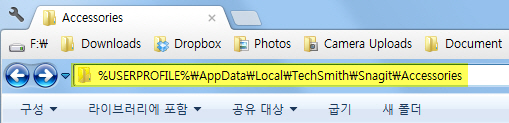 2. {EDA9F1DD-85B9-44F6-9D3C-125B2DD1109D} 라는 이름의 폴더가 생기는데, 이 폴더를 탐색기를 실행시켜 %USERPROFILE%\AppData\Local\TechSmith\Snagit\Accessories 경로를 주소창에 입력하신 뒤 붙여 넣기 합니다.