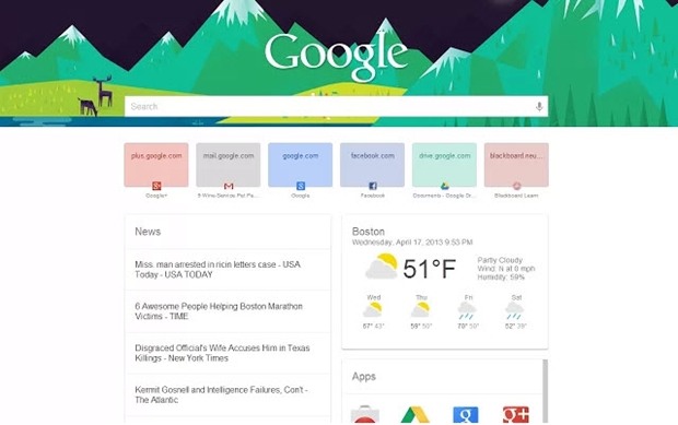 Google Now의 디자인을 표방하여 만들어진 새 탭 페이지입니다. 검색창, 뉴스(영문), 날씨 그리고 설치된 앱 목록을 구글 나우의 카드 방식으로 볼 수 있습니다. 단점으론 영문 뉴스만을 제공하는 점, 날씨 표기가 화씨 표기만 된다는 점입니다.