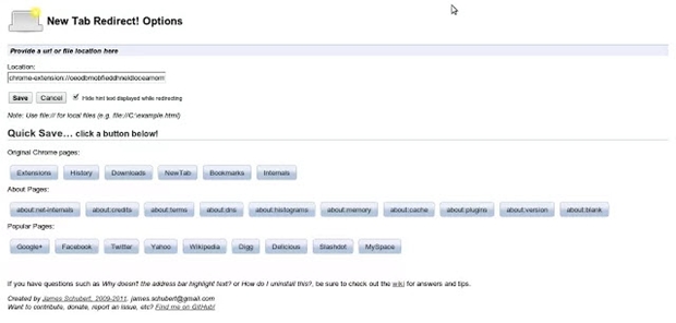 위에서 소개해드린 새 탭 부가기능과 달리 New Tab Redirect는 확장 기능, 방문 기록, 플러그인 등의 오리지널 크롬 페이지 혹은 단일 웹페이지 주소 등을 설정 후 새 탭으로 열어주는 기능입니다. 여러 웹사이트를 선택하는 Tab이 아닌 원하는 페이지를 바로 열고 싶으신 분들에게 유용할 듯.