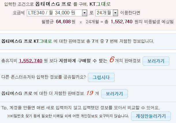 그래서 오늘은 뽐뿌, 오픈마켓 등에 올라온 스마트폰 가격 정보를 비교해주고 옵션에 따른 유지비용을 간단히 계산해볼 수 있는 '폰스터'라는 사이트를 소개하겠습니다.