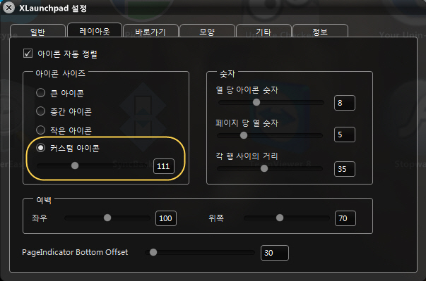△ 레이아웃 부분엔 아이콘의 크기와 가로 열에 배치할 아이콘 숫자 등을 설정할 수 있습니다. 개인적으로 큼지막한 아이콘을 좋아해서 커스텀 아이콘 부분을 111 정도로 수정하였습니다. (참고로 22인치 모니터를 사용합니다)