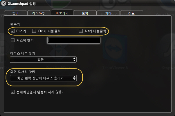 △ 런치패드를 실행하는 단축키나 제스처 등을 설정할 수 있습니다. F12 단축키를 누르거나 마우스 휠 버튼을 두 번 클릭하는 등 여러 가지 옵션이 있으니 취향에 맞게 설정하시길 바랍니다. 개인적으로 화면 모서리 핫키 - 화면 왼쪽 상단에 마우스 올리기를 추천드립니다. 마우스를 화면 좌측 상단 모서리 부분으로 가져가시면 자동으로 런치패드가 실행됩니다. (맥 OSX와 동일)