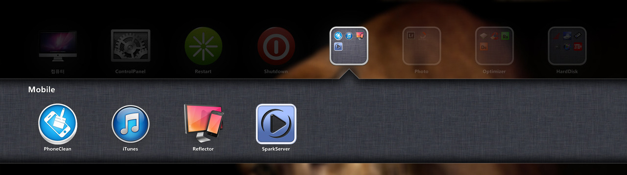 추가로 마우스 우클릭 - 추가 버튼을 누르시면 컴퓨터, 휴지통, 음악, 사진 등의 아이콘을 추가시킬 수 있고 모두 OSX 디자인 아이콘입니다. 또한 컴퓨터 재시작, 종료 버튼 역시 제공하고 있어 유용하게 사용하실 수 있습니다.