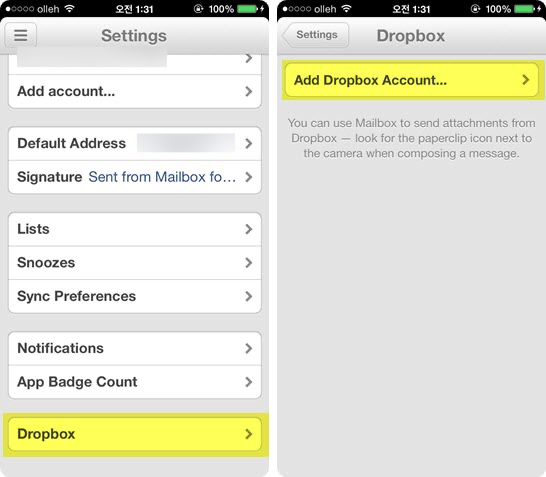 Settings > Dropbox > Add Dropbox Account... 에서 드롭박스 계정을 추가만 해주시면 자동으로 1GB 용량이 증가합니다. 간단하죠?