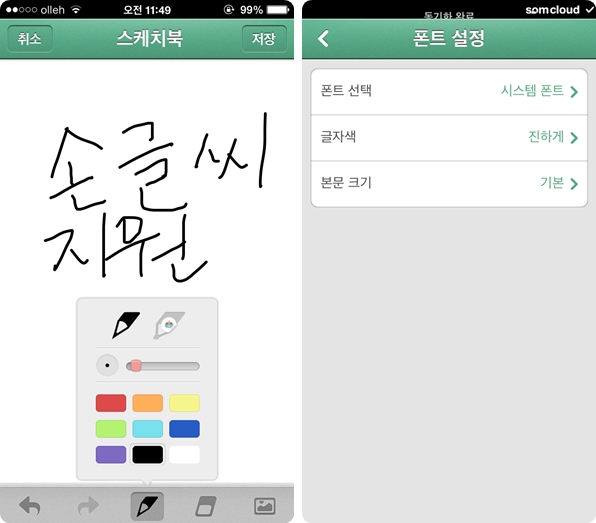 스케치북이란 이름으로 손글씨 쓰기 기능을 지원합니다. 색상과 두께 정도 등을 설정할 수 있습니다. 또한 솜노트의 글자가 너무 흐리거나 작다면 설정에서 글자색을 진하게 변경하거나 크기 혹은 폰트 변경이 가능합니다.