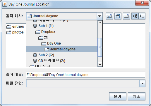 이제 dayone-2.0.0.jar 파일을 실행시킵니다. 초기 실행 시 Journal Location 폴더 지정 창이 나오는데 방금 말씀드린 드롭박스 내 Day One 동기화 폴더로 지정하시면 됩니다.