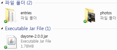 드롭박스로 동기화를 하셨다면 Dropbox\앱\Day One\Journal.dayone 폴더에 entries와 photos 항목이 자동으로 생성됩니다. 방금 다운로드한 dayone-2.0.0.jar 파일을 해당 폴더로 이동합니다(필수는 아닙니다).