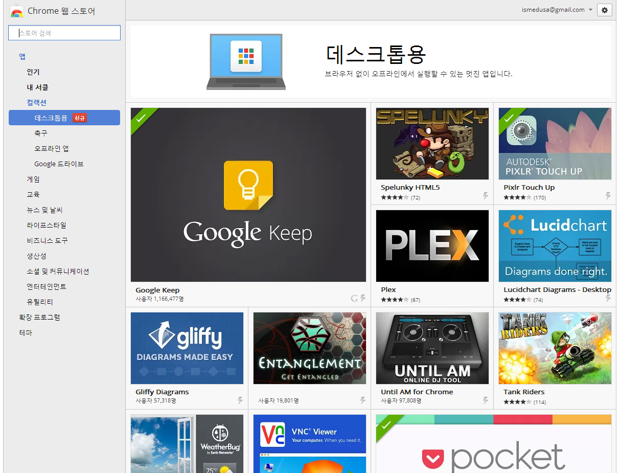 여러 서비스를 제공하는 구글에서 이쯤 되면 자체적인 데스크톱 OS가 나올 거 같은 느낌이 종종 들긴 했는데, 최근 구글 크롬 웹 스토어에 데스크톱용 컬렉션을 선보였네요, 크롬 브라우저를 실행하지 않아도 앱 런쳐를 통해 Pocket, Google Keep 등의 앱들을 실행시킬 수 있습니다. 아직 앱 런쳐를 지원하는 앱이 많지 않지만 활성화되면 구글 크롬으로 시작해 크롬으로 끝낼 수 있는 컴퓨팅 기반이 다져질 것 같습니다. 윈도우 운영체제에서 작동하지만 구글의 소프트웨어를 뿌리내려 잠식시키는 트로이 목마 전략을 구사한 점이 재밌습니다.