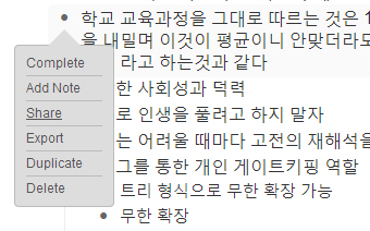 ▽ 마우스를 각 트리의 리스트 점에 대면 항목 완료(Complete), 현재 트리에 메모 추가(Add Note), 공유(Share), 내보내기(Export), 트리 복사(Duplicate), 삭제(Delete)를 수행하는 메뉴가 나오게 됩니다.
