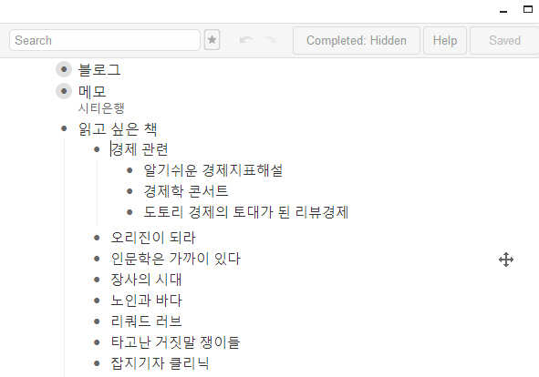 ▽ 항목 완료(Complete)는 To Do처럼 완료된 항목에 선을 그어줍니다. 완료 항목은 Completed : Hidden 버튼을 눌러 숨기거나 가릴 수 있습니다. Share버튼을 눌러 해당 트리를 공유하게 되면 트리의 기호가 보라색으로 변하게 됩니다. 또한 #Book 형식으로 태그를 지정할 수 있습니다만 한글은 아직 지원하지 않네요.