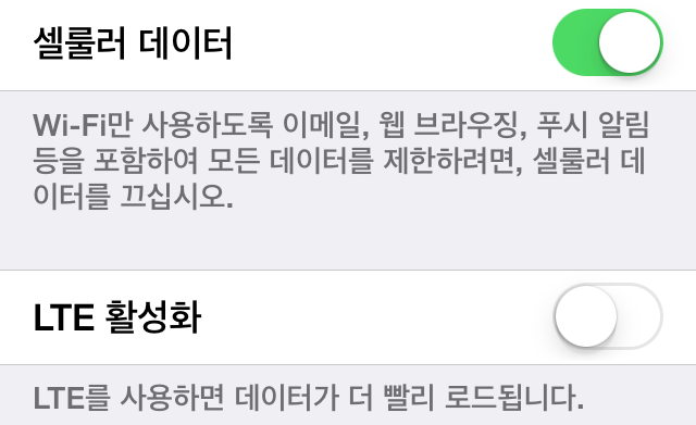 📌 설정 - 셀룰러에서 'LTE 활성화'를 비활성화하시면 됩니다.