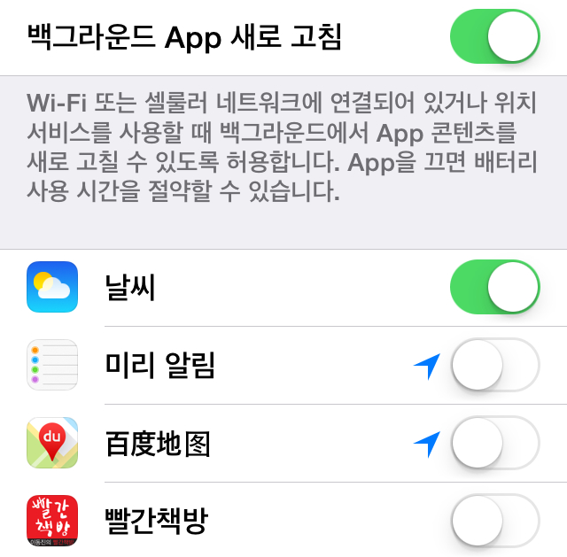 날씨나 지도 등 일반적으로 스마트폰을 사용하면서 매일매일 이용하는 앱을 제외한 앱들의 위치 서비스 옵션을 해제함으로써 배터리 타임을 늘릴 수 있습니다. 개인의 스마트폰 이용 패턴에 따라 위치 서비스를 사용하지 않아도 되는 앱들은 설정에서 꺼주세요.