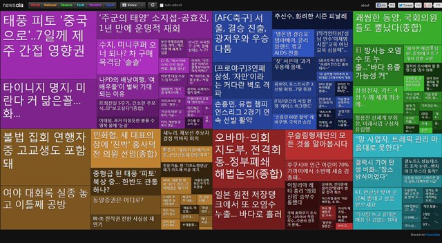□ Newsquare와 비슷하게 이슈들을 보기 쉽게 보여주는 사이트로 Newsola라는 곳이 있습니다. 얼핏 보면 윈도우의 메트로 UI와 비슷한 구조를 가지고 있는데요, 현재 가장 이슈가 되는 사건일수록 큰 사각형 블록으로 나옵니다. 뉴스스퀘어처럼 사건의 전후 관계를 이어서 보여주진 않지만 쟁점이 되는 이슈들을 한눈에 쏙 볼 수 있어 유용합니다.