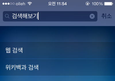 홈 화면에서 손가락을 아래로 밀면 스포트라이트 검색 박스가 뜹니다. iOS7로 업데이트되면서 웹과 위키백과 검색이 빠졌었는데 7.0.3 버전부터 다시 추가되었습니다. 개인적으로 브라우저 실행 없이 홈 화면에서 빠르게 검색할 수 있어 유용하게 썼던 부분입니다. 추후 위키백과 이외에 사용자 임의로 검색 도구를 추가할 수 있는 옵션이 생겼으면 좋겠네요.
