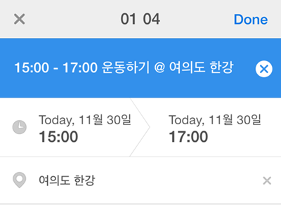 특히 빠른 스케줄 등록 기능이 있어 정말 유용합니다. 15:00 스케줄 내용 @ 장소 이런 식으로 입력하면 시간, 내용, 장소를 자동으로 인식합니다. 장소는 at, @ 두 가지 모두 가능합니다.
