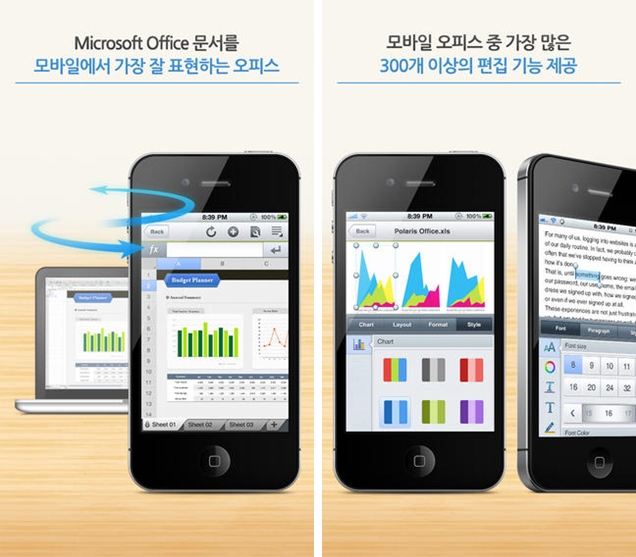 모바일 오피스 편집/뷰어 앱 중 갑이라고 할 수 있는 폴라리스 오피스. MS Office의 각종 문서 포맷 지원은 물론 한글 문서인 HWP와 PDF 파일도 수정하거나 볼 수 있습니다. 또한 영어, 중국어, 독일어 등 iOS 기기에서 지원하는 대부분의 언어도 지원합니다. GoodReader와 견주어 전혀 뒤지지 않는 빠른 속도도 빠질 수 없는 장점입니다.