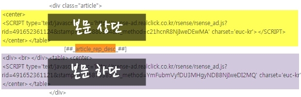 관리자 페이지 - 스킨 편집에서 article_rep_desc 를 검색합니다. article_rep_desc 앞에 광고 코드를 넣으면 본문 상단에, 뒤에 넣으면 본문 하단에 광고가 위치하게 됩니다. 아래 이미지를 참고해주세요.