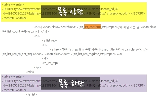 스킨 편집에서 list_conform 을 검색합니다. list_conform 위에 광고 코드를 넣으면 카테고리 글 목록 상단에 광고가 표시됩니다.