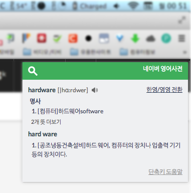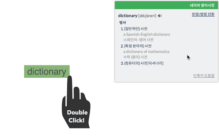 개발자 페이지엔 한영/영영 사전만 지원된다고 명시돼 있는데 테스트해 보니 한-영 사전도 지원하는 듯합니다. 한글을 더블클릭해도 그에 맞는 영어 단어가 검색됩니다. 단축키 g를 통해 네이버 사전 페이지로 직접 이동할 수 있습니다.