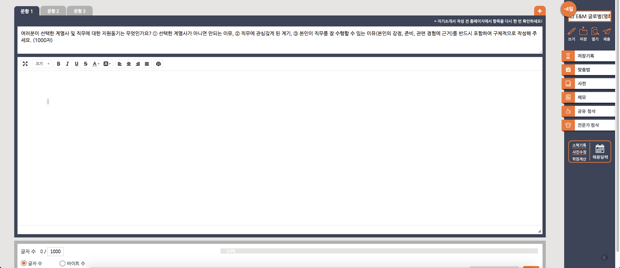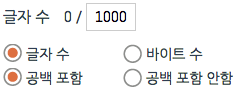자소서 입력 창 하단엔 입력한 글자 수가 자동으로 집계돼 보이는데요, 일반적인 채용 사이트의 글자 수 세기와 동일하므로 마음 편히 작성하시면 됩니다. 만약 채용사이트와 비교했을 때 글자 수가 일치하지 않는다면 '바이트 수'나 '공백 포함 안 함' 등에 체크하시어 테스트해보세요.