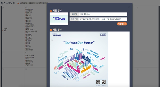 주요 기업의 채용 일정을 일목요연하게 볼 수 있습니다. 기업을 선택하면 모집 기간, 채용 페이지 이동, 자소서 바로 작성 기능이 있어 정말 편리하게 사용할 수 있습니다.